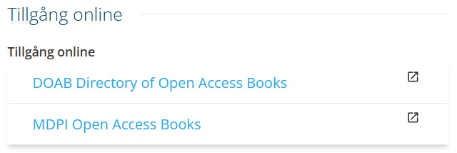 Skärmdump som visar tillgängliga alternativ för åtkomst för en resurs. Rubriken är "Tillgång online", under den finns två rader med alternativ med namnet på plattformen som$€sursen finns på.