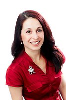 • Woman wearing a blue top, gold earrings, and a necklace, smiling and facing forward against a white background.