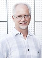 • Man wearing glasses and a light blue collared shirt, facing forward and smiling slightly, posed against a white background.