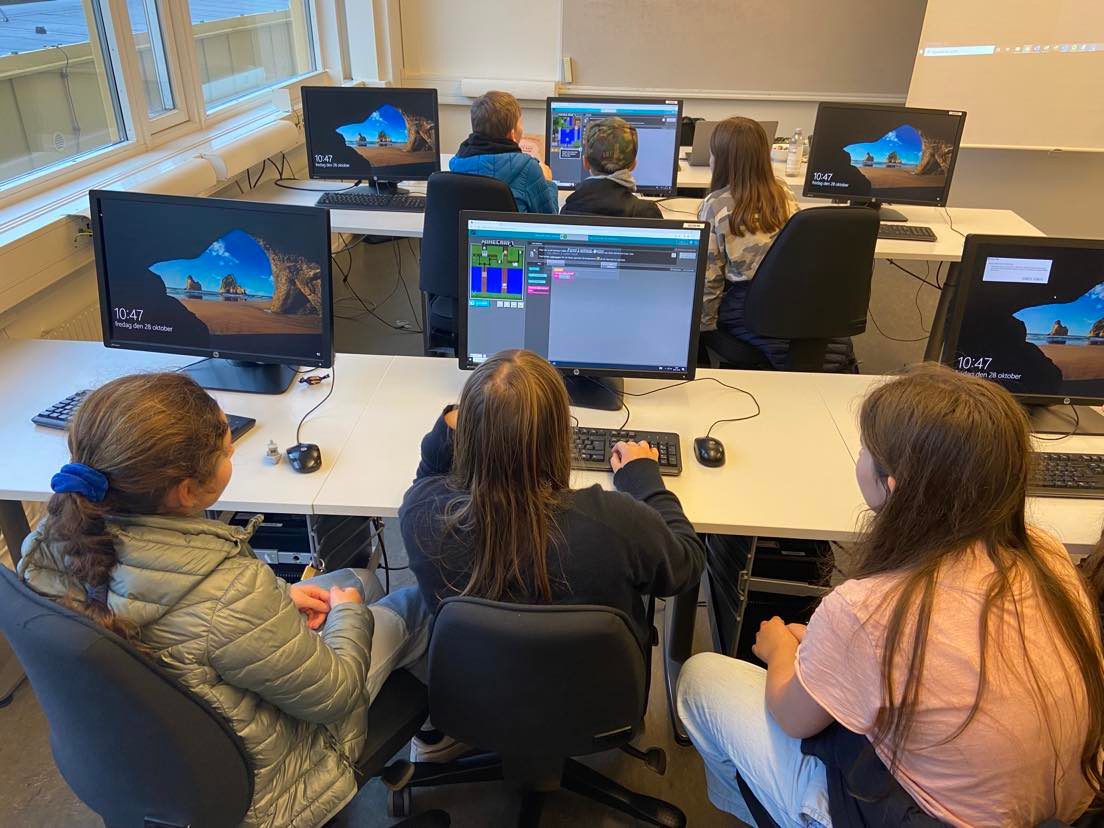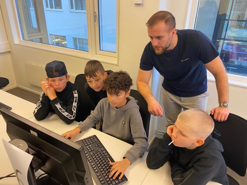 At one learning station, the students from Torpa School would use coding to develop and control the robot in the computer game Minecraft to help them solve different levels. In the front row from left: Nika Pantelic, Nils Svärd and Einar Lejdemark.