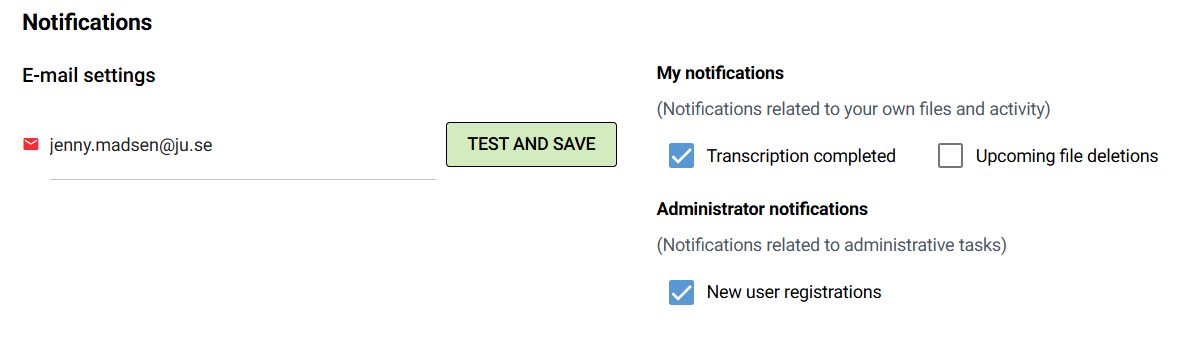 If you want to receive email notifications when your transcription/subtitling is complete or be reminded when your files are approaching their deletion date, you must go to "User settings" within the service, fill in your e-mail address and check the boxes to activate these.