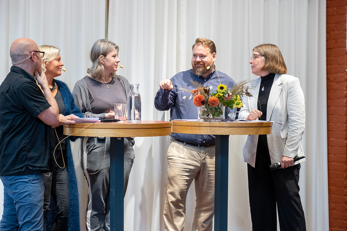On 16 September, the University Library inaugurated its new exhibition, Research in Colour – a visual journey through 30 years of scholarly publishing at Jönköping University. Through vibrant visualisations, visitors can enjoy a unique insight into how research at the university has grown, evolved, and become increasingly interconnected since the establishment of the Jönköping University Foundation in 1994. JU president Måns Svensson gave the opening speech, followed by a panel discussion with representatives from all four schools.