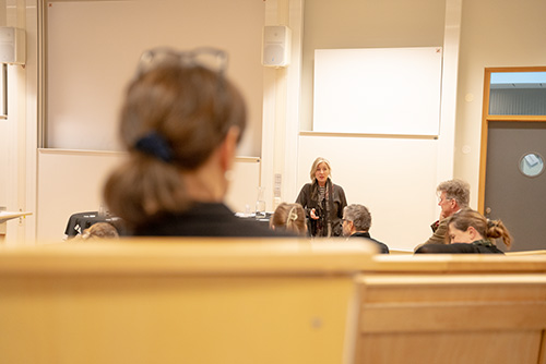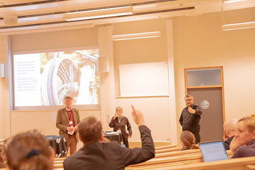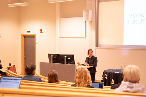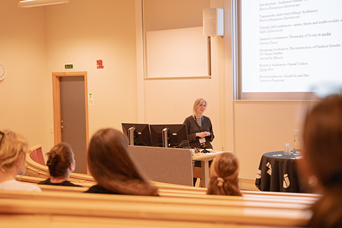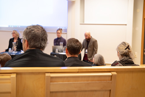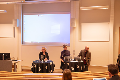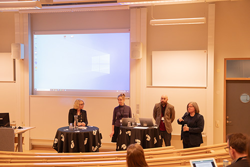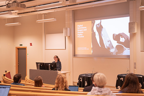 Därefter föreläste Kari Andén Papadopoulos, professor i MKV vid Stockholms universitet, med titeln “The media forensic production of visual evidence in the documentation and prosecution of human rights abuses” (Mediaforensisk produktion av visuella bevis vid dokumentation och åtal av brott mot de mänskliga rättigheterna) och sedan Stina Bengtsson, professor vid Södertörns högskola, med titeln “Ecologies of meaning: Understanding media as meaning-making practice” (Ekologier av mening: Att förstå media som en meningsskapande praktik).