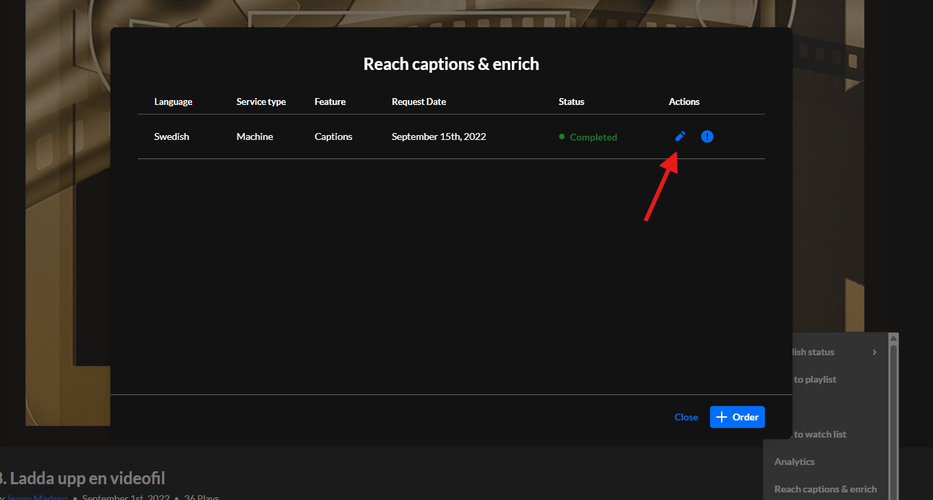 Det tar en stund innan din textfil är klar men du blir meddelad via e-post när den är redo för dig att granska och eventuellt redigera i. Du ser status för din beställning i samma fönster där du beställt textningen. När din textning är klar kan du i samma fönster klicka på ikonen som ser ut som en penna för att komma till redigeringsverktyget.