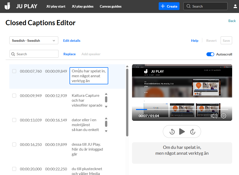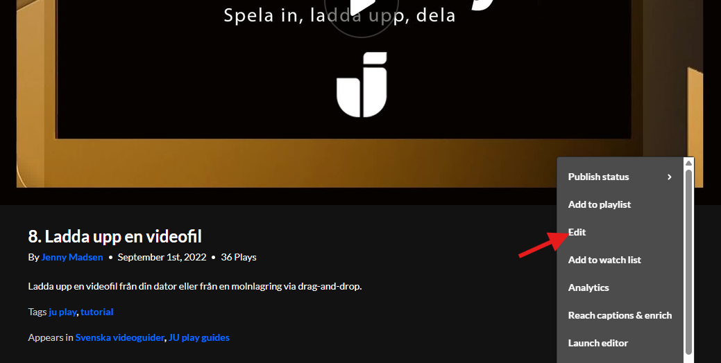 Vill du återkomma till att redigera din undertextning vid ett senare tillfälle hittar du redigeringsverktyget på samma ställe där du beställde undertextningen, dvs du klickar på din video inne i JU Play och klickar sedan på de tre prickarna bredvid Share-knappen och väljer Reach captions & enrich. Därefter klickar du på penn-ikonen.