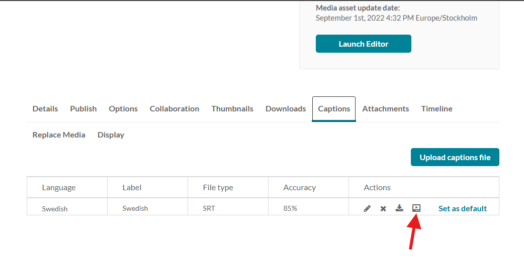 Därefter går du till fliken Captions som nu innehåller en tabell med din/dina undertextningsfiler. Längst ut till höger i kolumnen för Actions finner du en överstruken ikon som ser ut som en mediaspelare med en play-knapp i. Klicka på den så att överstrykningen försvinner.