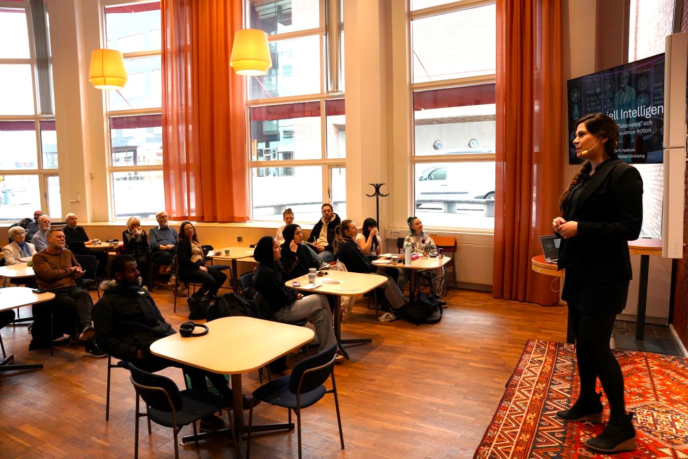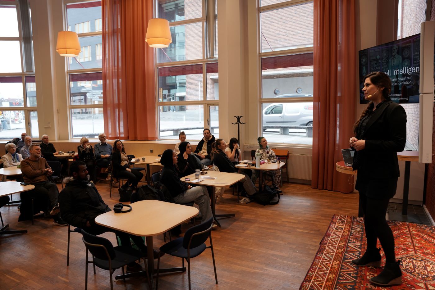Maria Hedblom, universitetslektor i Datavetenskap på JTH, föreläste om AI i JMW-salen på Högskolebiblioteket den 27 mars. Flera åhörare kom fram och pratade med henne efteråt.