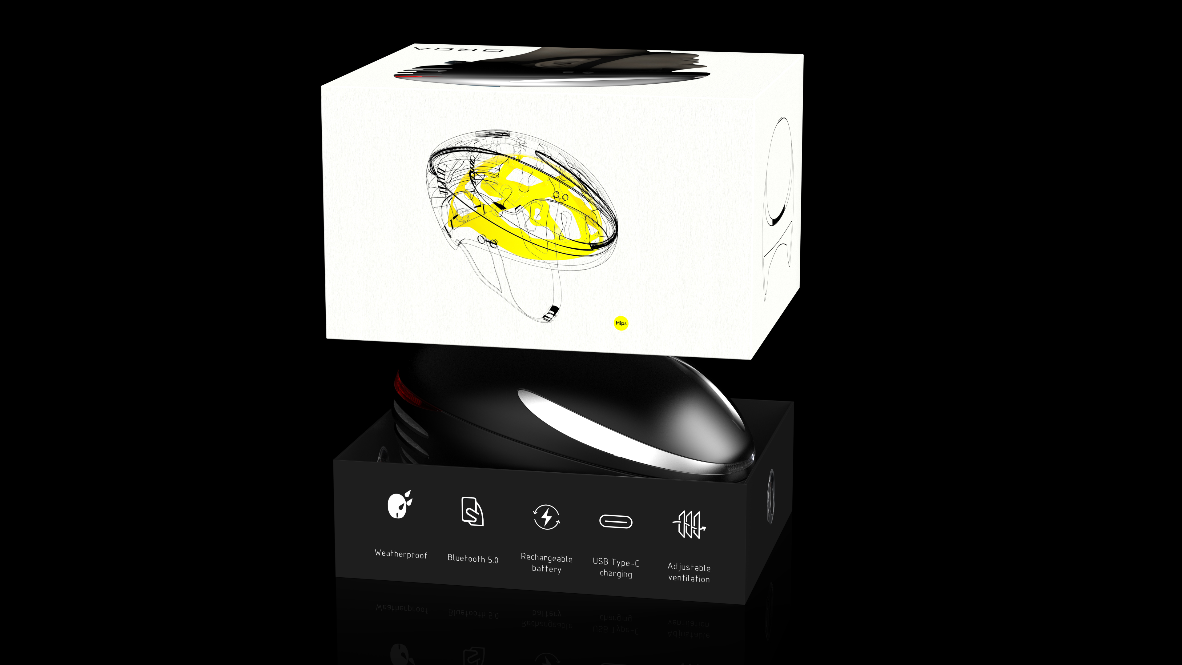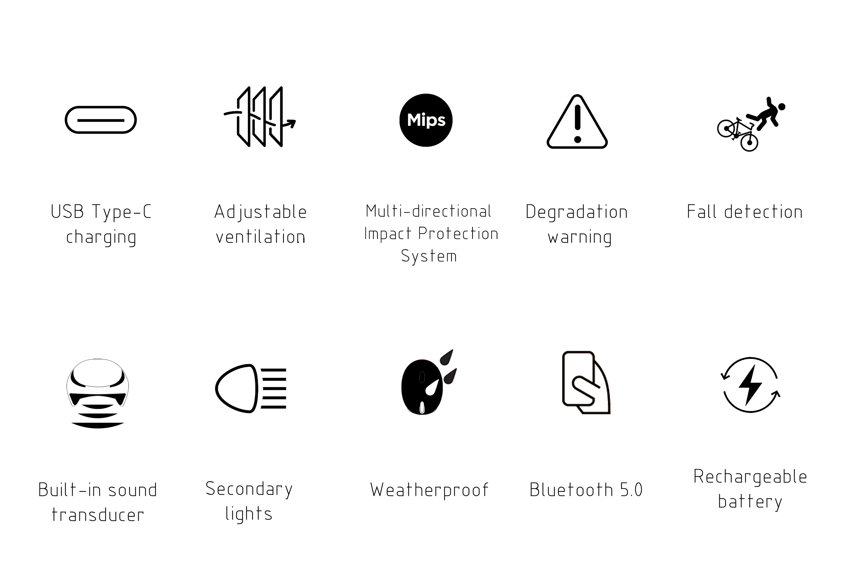 The bike helmet comes in a simple box and supports Bluetooth connectivity with smartphones. The design style kept minimal and urban as the majority of users are commuting in cities with their bikes. The functional Scandinavian design provides the user with features that make bike rides safer and in case of a damage, a close relative is informed about the position of the rider. It can also warn the user in case of material degradation and with a modular design the parts can be replaced, which is a more sustainable way than throwing an entire helmet out.