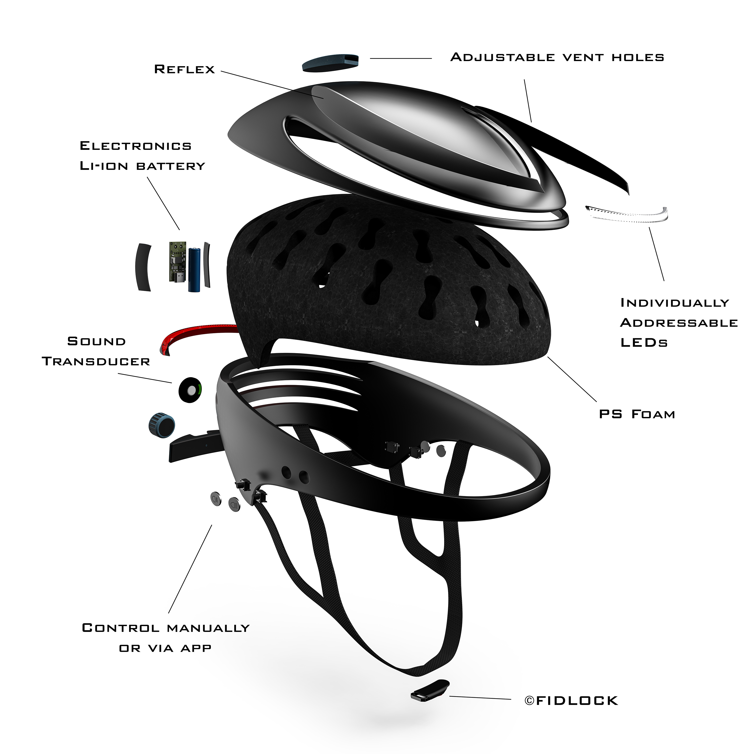 The problem with current bike helmets is the average lifetime of 3-5 years. The modular assembly of this smart bike helmet makes it possible to replace broken parts and warn the user in case of material degradation. The helmet features handy functions that makes biking safer, with style.
