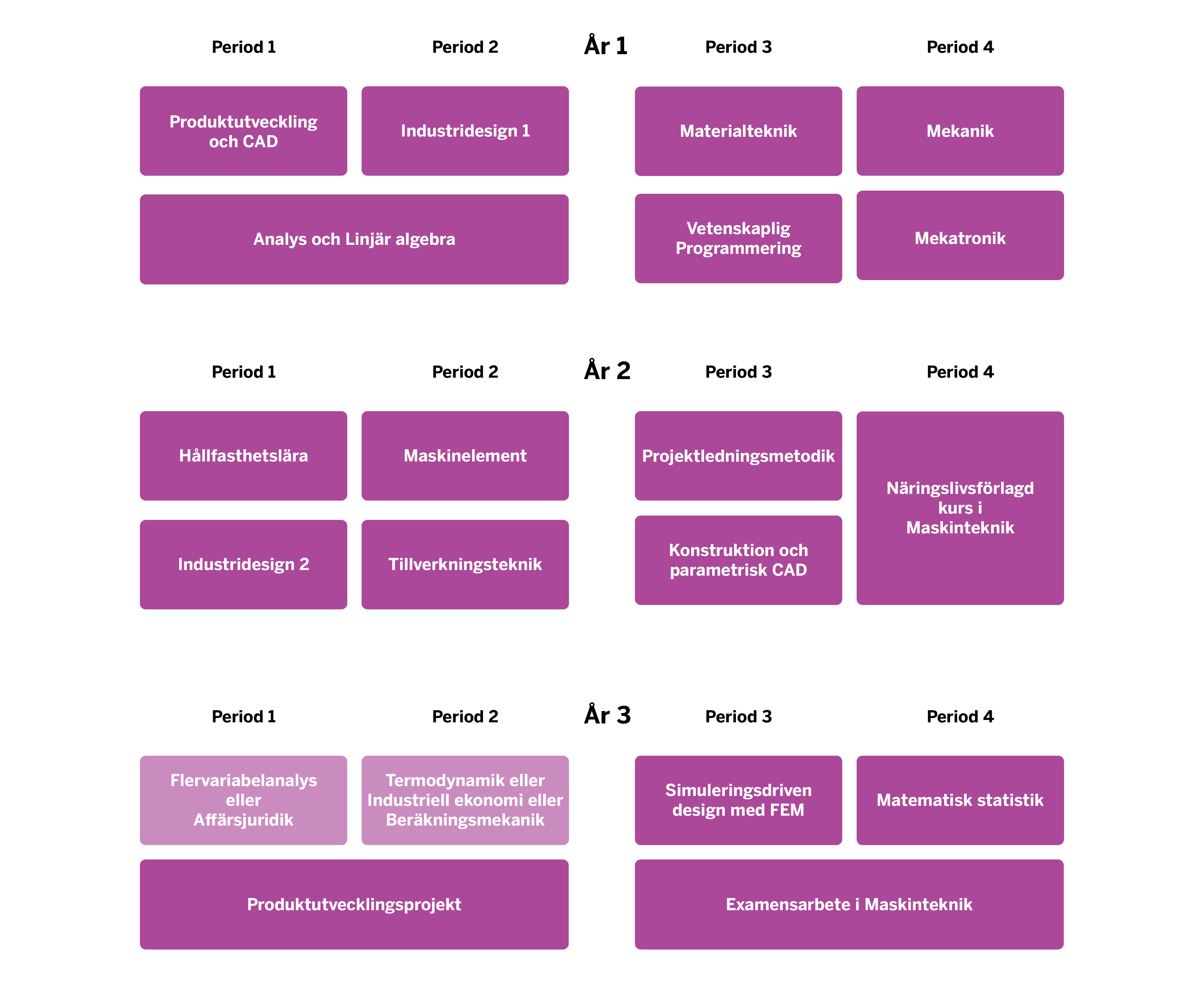 ## Om programmet I en tid där både företag och samhälle står inför stora utmaningar krävs ingenjörer som kan tänka både teknisk och kreativt. För att möta framtidens behov behöver produkter utvecklas snabbt, hållbart och med användaren i fokus. Med förmåga att ta idéer hela vägen från skiss till färdig lösning blir du en nyckelkompetens i denna omställning. Maskinteknik: Produktutveckling och design är ett treårigt högskoleingenjörsprogram där du lär dig hela processen inom modern produktutveckling – från behovsanalys och idéarbete till konstruktion, beräkning, visualisering och tillverkning. ### Idé, form och funktion Du får en bred teknisk grund att stå på, samtidigt som du utvecklar dina färdigheter inom problemlösning, formgivning och digital modellering. Under utbildningen jobbar du med moderna verktyg som exempelvis SolidWorks, Alias och FEM-simulering, och tränar på att samarbeta i team, driva projekt och kommunicera tekniska lösningar. Du läser kurser i bland annat: - Produktutveckling, konstruktion och CAD - Industridesign - Materialteknik och maskinelement - Mekatronik, mekanik och hållfasthetslära - Programmering och projektledning Du lär dig att ta fram produkter som fungerar bra, är enkla att använda och har en tilltalande design. Under utbildningen jobbar du med digitala verktyg för att konstruera, modellera och simulera produkter i 3D. Du får en tydlig förståelse för hur design, teknik, användare och produktion hänger ihop – och tränas i att arbeta strukturerat, kreativt och lösningsfokuserat genom hela utvecklingsprocessen. Du övar också på att förklara och presentera dina idéer visuellt och tekniskt, både på egen hand och tillsammans med andra. ### Praktik och näringslivskoppling En viktig del av utbildningen är den **näringslivsförlagda kursen (NFK)** där du får omsätta dina kunskaper i praktiken, ute på ett företag. Det är en möjlighet att jobba med verkliga projekt, bygga värdefulla kontakter och få inblick i din framtida yrkesroll. Teknik och design är internationella områden och du har goda möjligheter att få internationell erfarenhet. Under termin 4 kan du välja att studera vid ett av våra partneruniversitet runt om i världen, eller göra praktik utomlands. Det ger dig nya perspektiv och stärker ditt CV på en global arbetsmarknad. ### Karriärmöjligheter och vidare studier Som högskoleingenjör i maskinteknik med inriktning mot produktutveckling och design är du eftertraktad i många branscher. Du kan till exempel jobba som produktutvecklare, designingenjör, projektledare, testingenjör, konstruktör eller teknisk säljare. Du kommer också vara behörig att söka till masterprogram vid JTH eller till andra masterutbildningar vid lärosäten över hela världen.